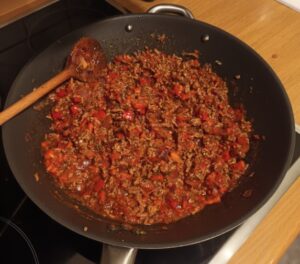 Sobald auch die Zwiebeln und der Knoblauch leicht braun werden, ist es Zeit die stückigen Tomaten und das Tomatenmark hinzuzugeben. Rühre alles kräftig um und stelle den Herd auf die niedrigste Stufe.